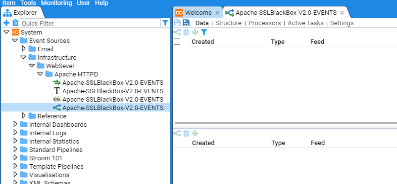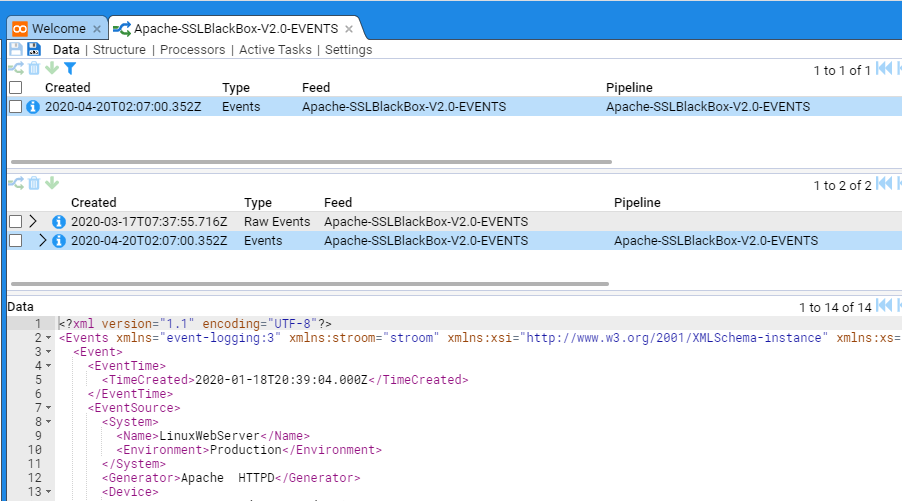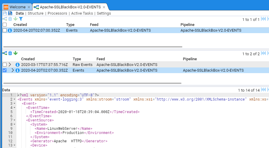 In this example we will build on our Apache-SSLBlackBox-V2.0-EVENTS event feed and enable automatic processing of raw event data streams.