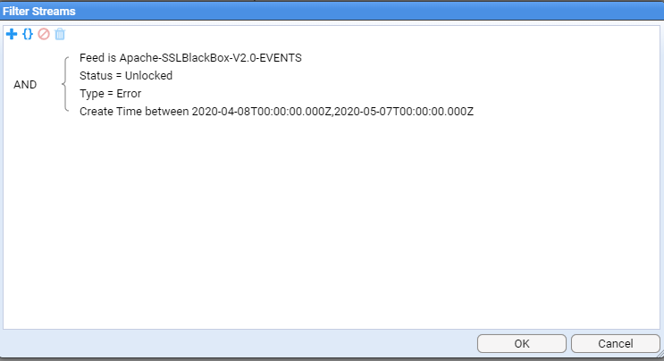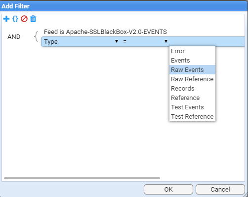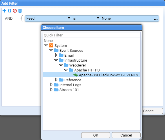 To do this, first click on the Add Term icon. Keep the term and operator at the default settings, and select the Choose item icon to navigate to the desired feed name (Apache-SSLBlackBox-V2.0-EVENT) object