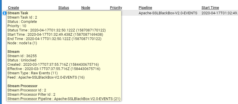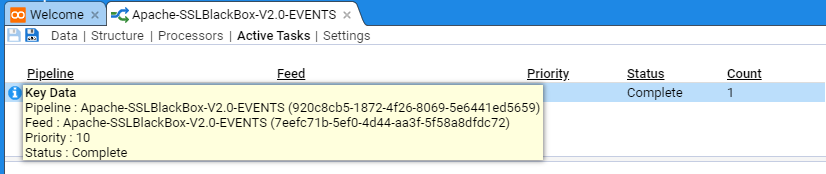 If you select the Active Tasks sub-item, you will see a summary of the recently processed streams