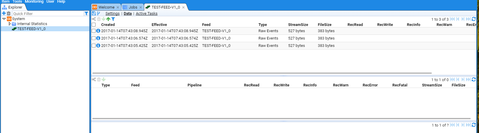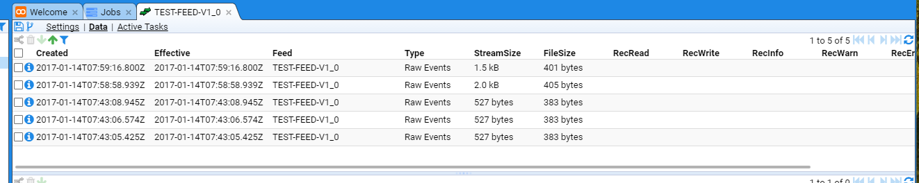 And on refreshing the top pane of the TEST-FEED-V1_0 tab we see that two more batches of data have arrived.