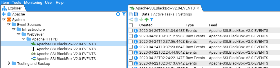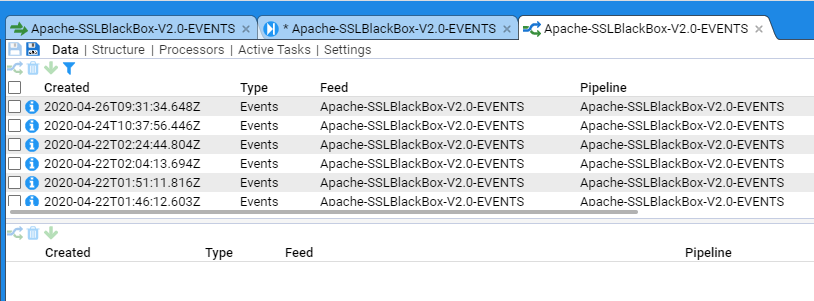 Double clicking on the Apache-SSL-BlackBox-V2.0-EVENTS Feed will select it, and bring up the Feed’s tab in the main window.