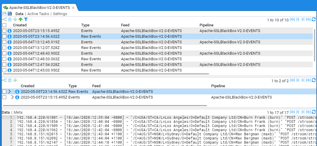 The feed for this exercise is the Apache-SSL-BlackBox-V2.0-EVENTS event feed which processes Apache HTTPD SSL logs which make use of a variation on the BlackBox log format.
