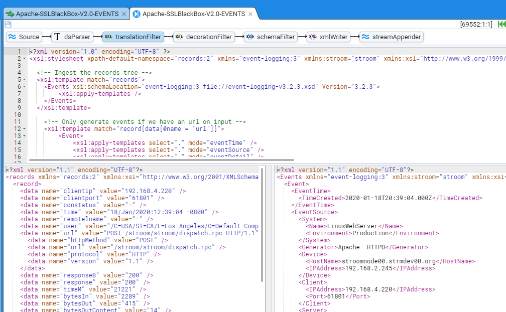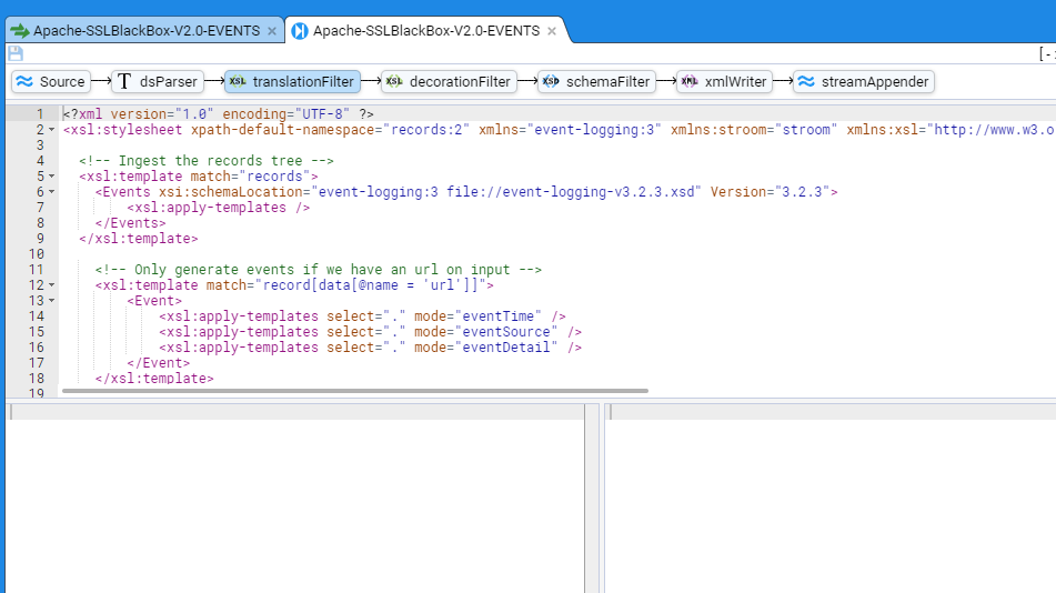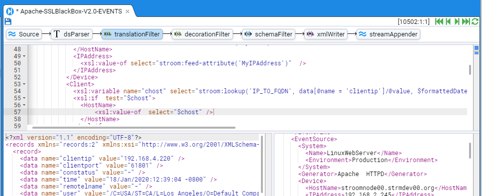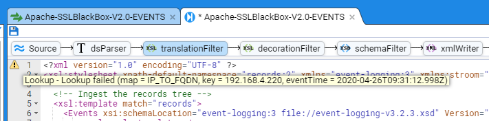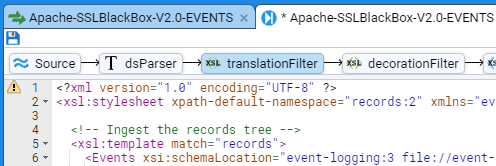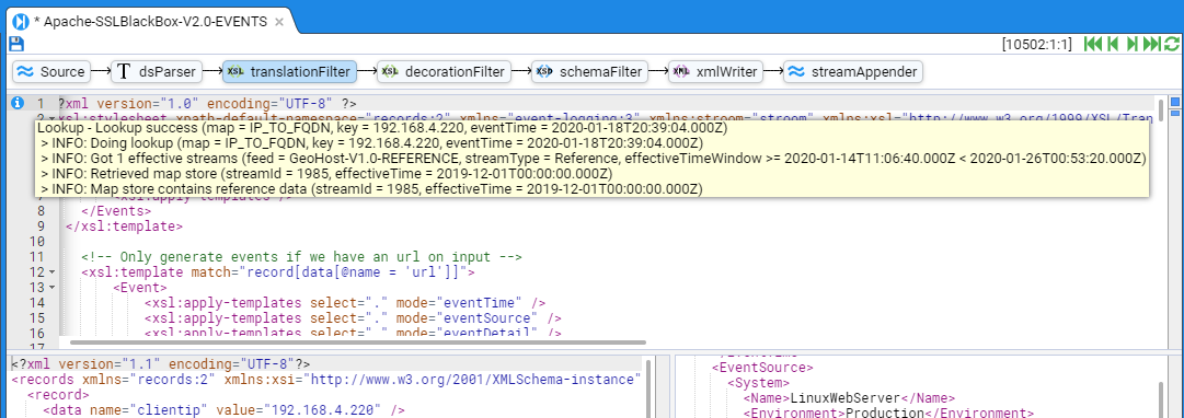 The middle pane shows the Properties for this element - we see that it has an xslt property of the APACHE-BlackBoxV2.0-EVENTS translation.