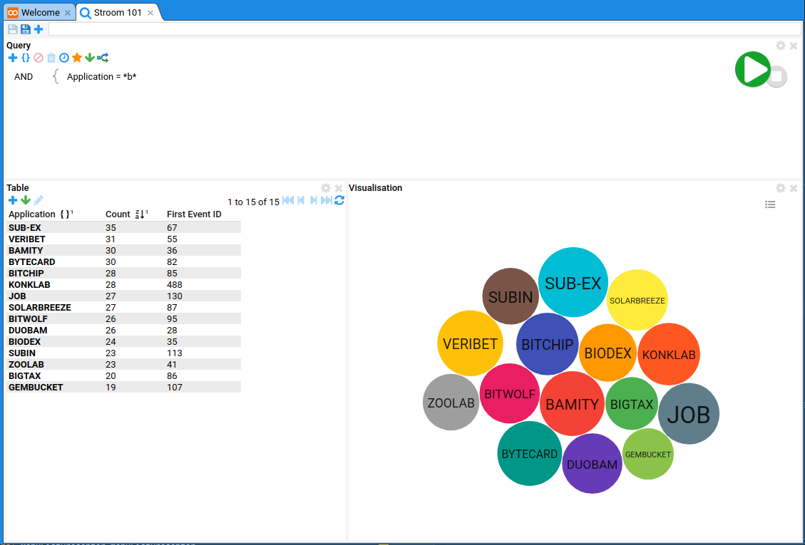 Now click the large green and white play button to run the query. You should see 15 Applications and their counts returned in the table.